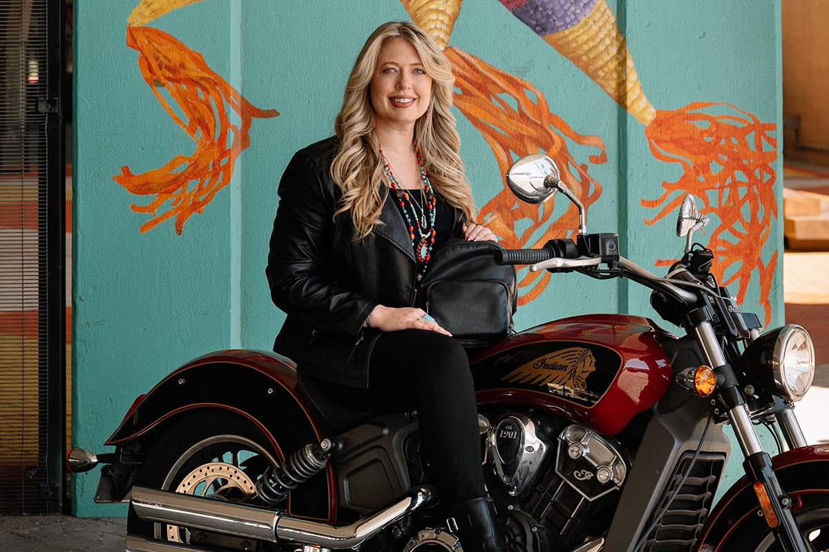 You may have also spotted Krystal riding to work or events around town. Her blonde locks flow as she rides her Indian Scout motorcycle, often wearing black riding boots, jeans, a leather jacket, and a treasured bracelet on her left wrist given to her by grandfather. Her black leather bag is always hanging off her shoulder, too.